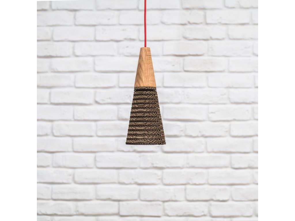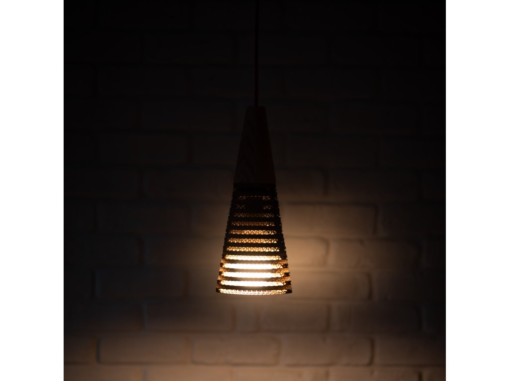 Z kartonu jsme vyřezali pravidelně se zužující kruhy aty seskládali do světlo propouštějícího kuželu. Vrcholem je vršek vysoustružený z dubového masivu.